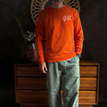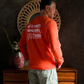 Nuestro diseño Art is Chaos Sweatshirt de color naranja es ajustada para hombre confeccionada con un 85 % de algodón peinado ring-spun orgánico y un 15 % de poliéster reciclado. Este cuello redondo clásico presenta ilustraciones dibujadas a mano con serigrafía hecha a mano en Madrid.